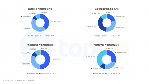 在休闲游戏和中重度游戏的广告变现中,激励视频与插屏广告的展示占比虽并非最高(休闲游戏:Banner>插屏>激励>原生广告/中重度游戏:原生>激励>插屏>Banner),但二者合计贡献了超过80%的广告收益。